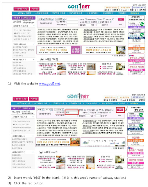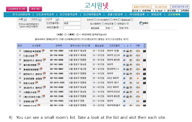 所以在確定額滿無望後,上網找了一下還是沒有很清楚的頭緒。寫信問了首爾大學後,其實他們入學辦公室根本就不太鳥你這種問題,別說住宿了,就連入學相關問題也是回的很慢,感覺效率就是很差。不過幸運地,我申請首爾大蓮建校區的辦公室小姐(非主校區)不一樣,她對我的問題幾乎都是盡量回答,還貼心的將滿是韓文天書的韓國考試院網站搜尋方式用電腦截圖講解(附於文後),讓我順利的就從第一筆資料中找到我這兩個月的首爾住宿地點:허브하우스(Herb house) http://dhr.hubhouse.kr。順利在我一下飛機後,在當地朋友帶領下,找到這家考試院,幸運地當晚現場看完房間後就入住。