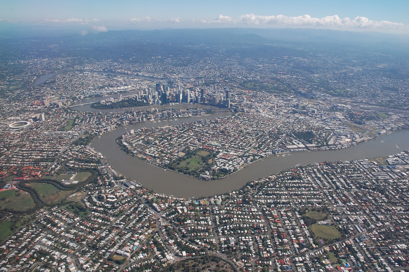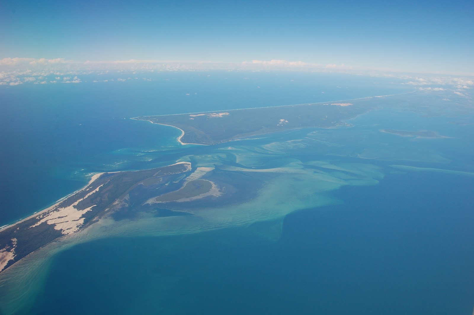 飛機在早上六點花兩個小時飛到布里斯本,接著花錢由國內航廈坐火車到隔壁的國際航廈。十一點再接著由布里斯本國際機場起飛。這天視野很好,可以清楚看到整個布里斯本市都在我腳下,飛機飛到的澳洲大陸邊緣,甚至可以明顯看到布里斯本外海美麗的沙島。