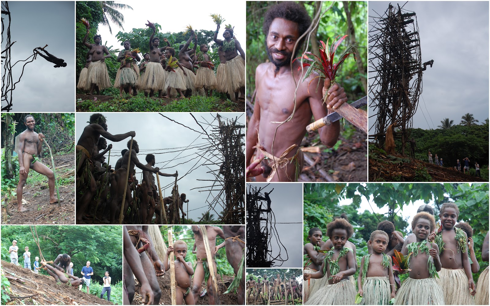 現場全身赤裸,只在下面重點部位套住保護的土著正在積極準備中。有人在高台前堀地,讓土質更鬆軟,這樣觸地時才比較不會受傷。接著時間一到,第一位勇者站上好幾公尺高的平台,在底下觀眾屏息等待中,突然一躍而下,觸地得分!所幸並沒有大礙。