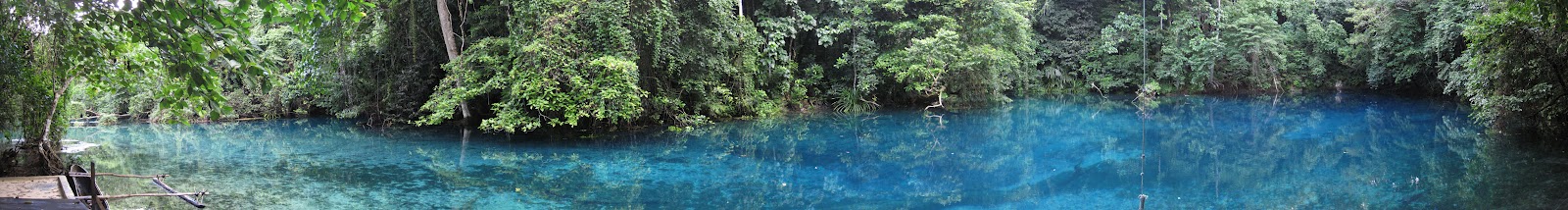 幽靜的森林裡只聽得見兩岸的蟲鳴鳥叫,船下的水質透明清澈,水面呈現碧綠色,水底是細細的白沙,偶有小魚游過。船平穩前進很快就到了藍洞,就像是仙女留在熱帶叢林的一面明鏡,池子呈現漂亮的寶藍色,這是由於礦泉水在陽光下的作用。司機也開車到了這裡來等我,問我待會要坐車還是船回去,我當然選擇難得幽靜的獨木舟之旅,於是司機和船伕兩人就在岸上等,而我在夢幻般的藍色池子裡游泳,這裡的水很涼,但蚊子也爆多,所以在下水見識神秘的藍洞池底後,不一會兒我就上岸了。