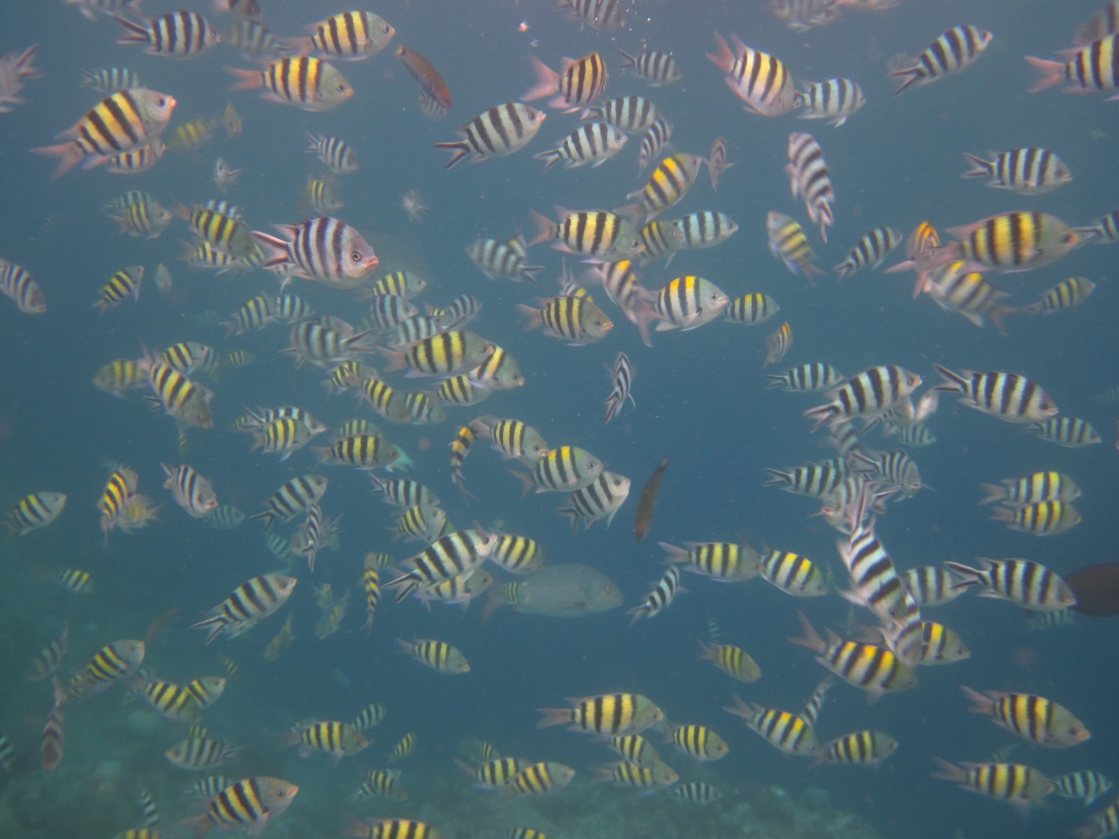 寄完明信片在附近稍微浮潛一下,就上岸準備登船,碼頭旁有數千隻魚苗很是壯觀。等所有人都上船後,船隻開到離島嶼一段距離便停了下來,我們在這裡下水。幸好浮潛並沒有讓我失望,水中隨行的教練這時拿出一個袋子,突然有彷彿成千上萬的魚游了過來,原來是要靠餵食的方式吸引牠們,這些五顏六色的魚群就在我們之間流竄,令人眼花撩亂,很想替這些身上有斑紋的取名叫蜂蜜魚,置身在魚群中央的感覺真奇妙。